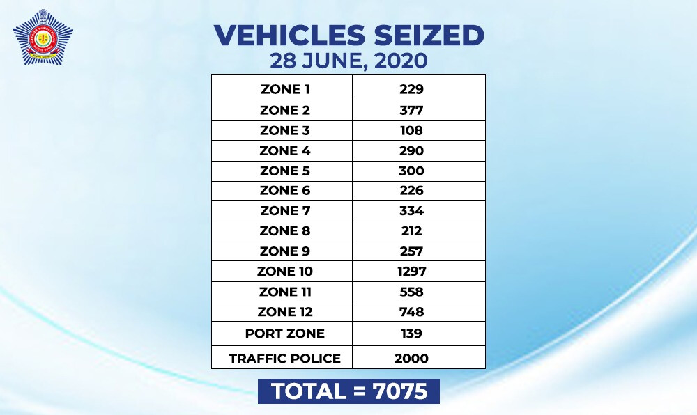 ०झोन 1 म्हणजेच कफपरेड, कुलाबा, मरीनड्राइव्ह, आझाद मैदान, माता रमाबाई मार्ग, डोंगरी, आणि जेजे मार्ग पोलिस ठाणे परिसरात पोलिसांनी 229 गाड्या जप्त केल्या आहेत.