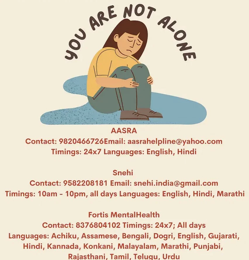 तुम्ही किंवा तुमच्या ओळखीचे कोणीही आत्महत्येच्या विचारांशी झुंज देत असल्यास, येथे मदत घ्या: