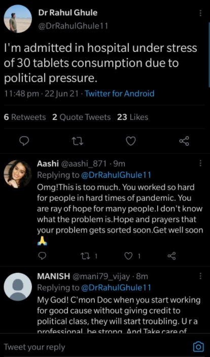 सध्या राहुल घुले यांना हॉस्पिटल मध्ये दाखल करण्यात आलं आहे. मागील काही दिवसांपासून राहुल घुलेंनी ट्वीट करत राजकीय एजंट्सपासून आपल्या जिवाला धोका असल्याचं म्हटलं होतं. यासाठी त्यांनी पंतप्रधान नरेंद्र मोदी यांच्याकडे देखील मदत मागितली होती.