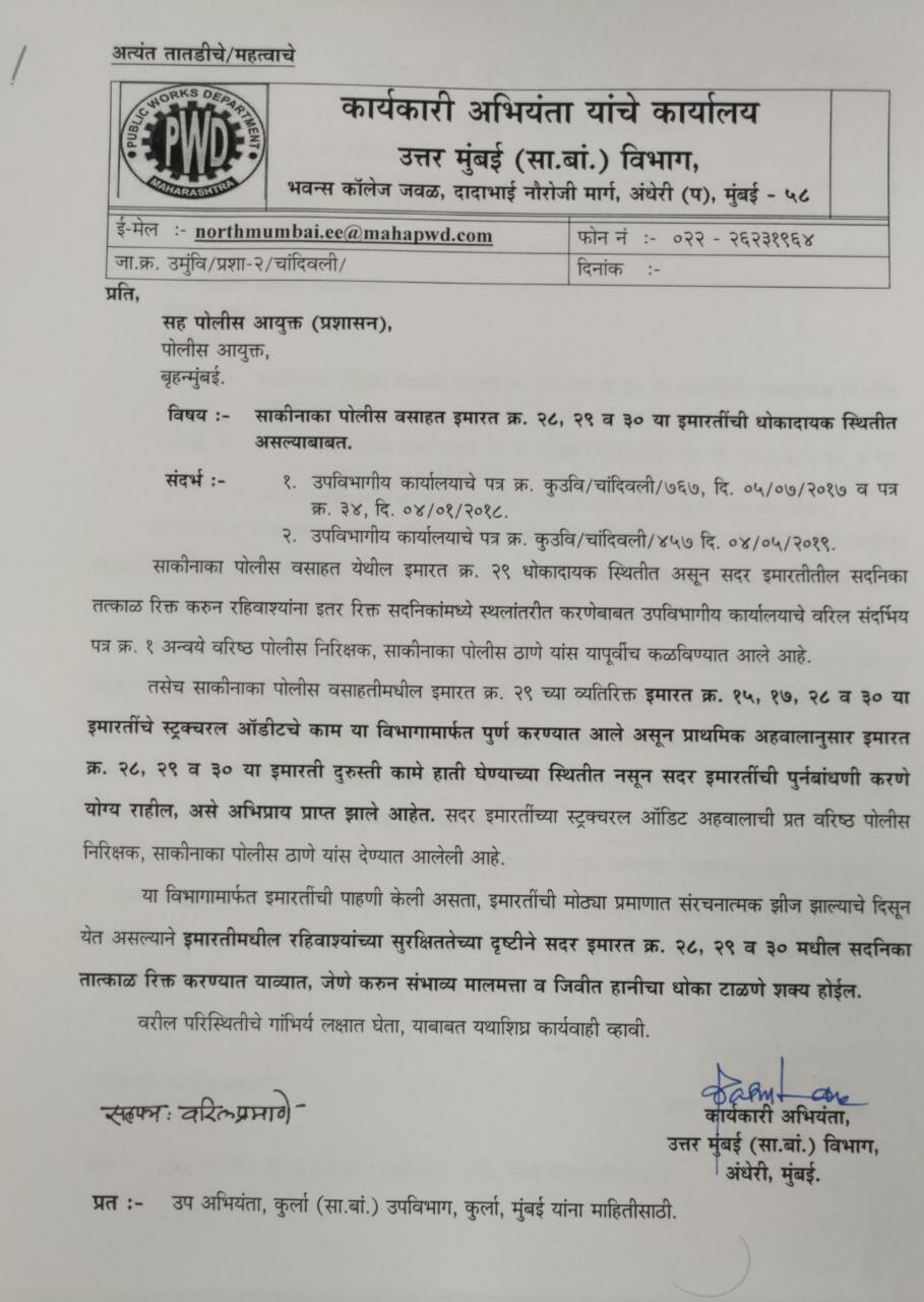 सार्वजनिक बांधकाम विभागाकडून आलेलं हे पत्र पोलिस आयुक्तांनी तात्काळ साकीनाका पोलिस ठाणे विभागातील वरिष्ठ पोलिस निरीक्षकांना पाठवलं. त्यानुसार पोलिसांनी रविवारी रात्री १० वाजता संबधित रहिवाशांना इमारत धोकादायक असल्याचं कळवत रिकामी करण्यास सांगितलं. यामुळे पोलिस कुटुंबियांमध्ये चिंतेचं वातावरण आहे.