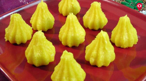 कृती : बेसनाच्या लाडवाच्या सारणाला साच्यात घालून मोदकाचा आकार द्यावा व मधे एक एक काजू भरावा.