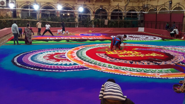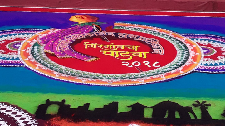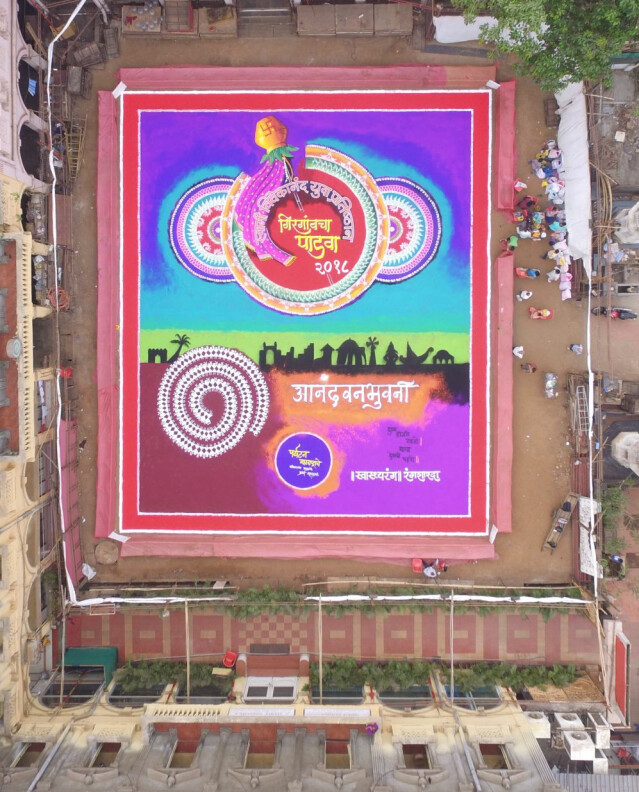 गुढी पाडव्याचा सांस्कृतिक वारसा पुढे चालवत उत्साहात भर घालण्यासाठी शहरात ठिकठिकाणी शोभायात्रांचं आयोजन केलं जातं. या शोभायात्रांमध्ये रंग उधळले जातात शुभेच्छांचे, आनंदाचे, लक्षवेधी वेषभूषेचे. अस्सल मराठमोळ्या फेट्यांपासून ते नाकातल्या नथीचा साजश्रृंगार करून प्रत्येक महाराष्ट्रीयन व्यक्ती या सणाचा आनंद घेत असतो. पाडव्याच्या निमित्ताने लक्ष वेधून घेणारी आणखी एक महत्त्वाची बाब म्हणजे दारापुढे दिसणारी रांगोळी. अशीच एक भव्य दिव्य रांगोळी भुलेश्वर जवळील माधवबाग पटांगणात साकारण्यात आली आहे. १४ आणि १५ मार्च असे दोन दिवस ही रांगोळी मुंबईकरांना पाहता येणार आहे.