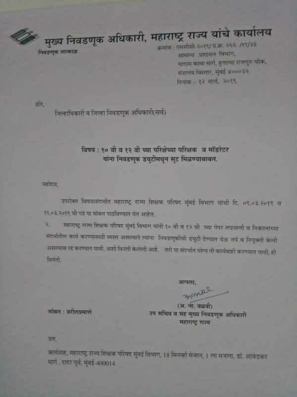 यामुळे गेल्या ३ दिवसांपासून भाजपा प्रदेश शिक्षक आघाडीसह विविध शिक्षक संघटनांनी दहावी बारावीच्या परीक्षक आणि नियामकाची निवडणुकीच्या कामातून सुटका करावी अशी मागणी करत होते. यानुसार अखेर निवडणूक आयोगाच्या उपसचिव व सह मुख्य निवडणूक अधिकारी अनिल वळवी यांनी परिपत्रक काढून बोर्डाचे पेपर तपासणीचे काम करण्याऱ्या शिक्षकांना निवडणुकीची कामे देऊ नयेत व एखाद्या शिक्षकाची नियुक्ती करण्यात आली असल्यास ती तात्काळ रद्द करावी असे आदेश जिल्हाधिकाऱ्यांना दिले आहेत. या आदेशामुळे अनेक शिक्षकांनी निवडणुकीच्या कामातून सुटकेचा निःश्वास सोडला आहे. या निर्णयामुळे दहावी बारावीची निकाल वेळेत लागण्याची चिन्हे निर्माण झाली आहे.