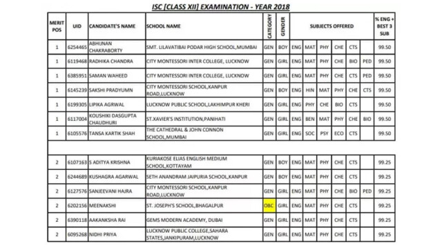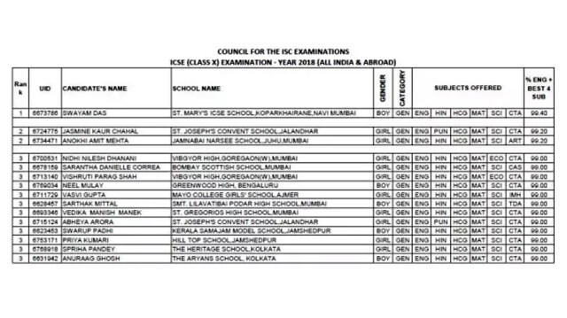 बारावीच्या परीक्षेत मुंबईच्या पोदार हायस्कूलचा अभिज्ञान चक्रवर्ती आणि तानसा शाह देशात पहिले आले, तर दहावीत सेंट मेरी हायस्कूल, कोपरखैरणेचा स्वयं दास देशात पहिला आला.