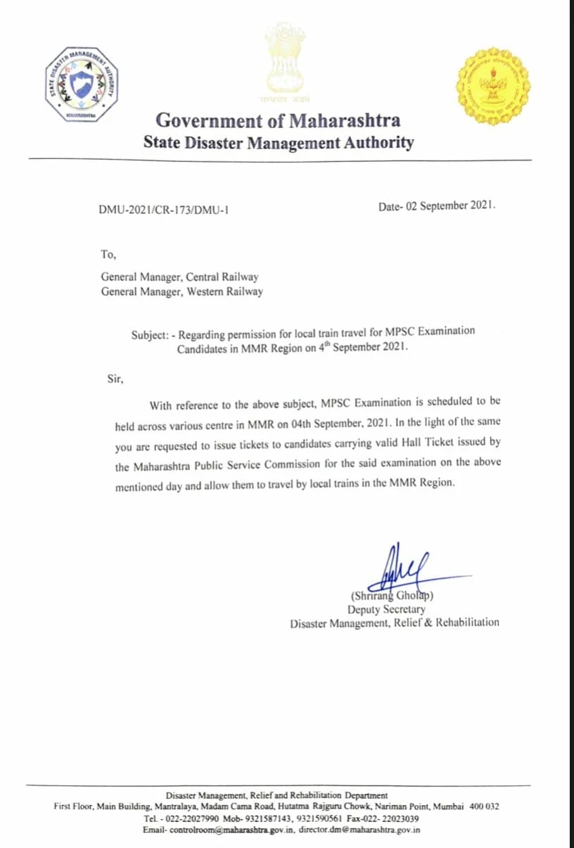 एमपीएससीची (MPSC) संयुक्त पूर्वपरीक्षा ४ सप्टेंबरला होणार आहे. मुंबईत येणाऱ्या परीक्षार्थींना परीक्षा केंद्रावर पोहोचण्यासाठी अडचणींचा सामना करावा लागण्याची शक्यता आहे. त्यामुळे त्यांना लोकल प्रवासाची परवानगी देण्यात यावी अशी मागणी केली जात होती. केवळ परीक्षेपूर्तीच ही रवानगी देण्यातआली आहे.