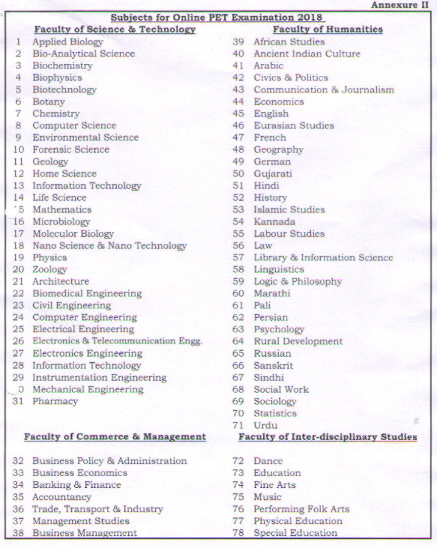 'पेट' परीक्षा ४ विद्याशाखातील ७८ विषयांमध्ये घेतली जाणार असून हे विषय विद्यापीठाच्या वेबसाईटवर उपलब्ध आहेत. www.mu.ac.in या विद्यापीठाच्या वेबसाईटवर ६ नोव्हेंबर अर्ज उपलब्ध असणार आहे. ही पेट परीक्षा ऑनलाईन असून संशोधन पद्धती व विद्यार्थ्याचा पदव्युत्तर अभ्यासक्रमाच्या विषयावर आधारित असणार आहे.
