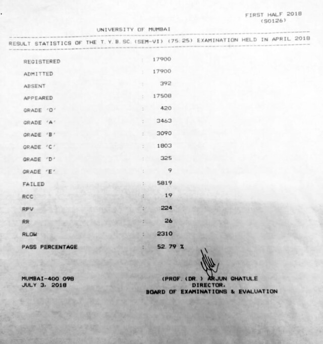 मुंबई विद्यापीठानं एप्रिल-मे २०१८ मध्ये घेतलेल्या तृतीय वर्ष बीएससी सेमिस्टर पाच व सहा निकाल नुकताच जाहीर करण्यात आला आहे. बीएससी सेमिस्टर सहाच्या परीक्षेत १७ हजार ५०७ विद्यार्थी बसले होते. यातील ९ हजार ११० विद्यार्थी उत्तीर्ण झाले असून या परीक्षेचा एकूण निकाल ५२.७९ टक्के लागला आहे. २०१७-१८ या शैक्षणिक वर्षातील पदवी परीक्षांमधील हा पहिला निकाल विद्यापीठानं जाहीर केला आहे.