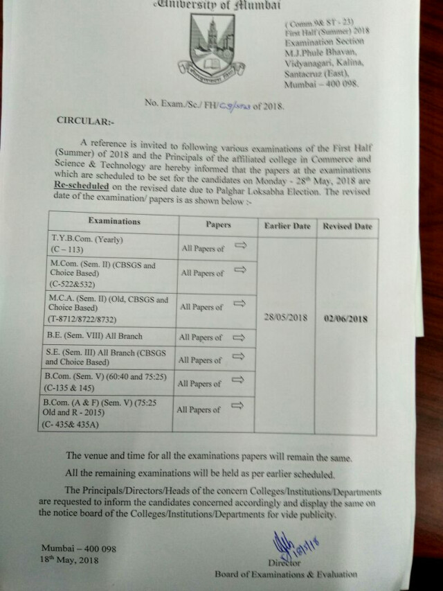 मुंबई विद्यापीठाने नुकतंच याबाबतच परीपत्रक जाहीर केले आहेत. या परीपत्रकानुसार परीक्षांचे वेळ व परीक्षा केंद्रात बदल होणार नसल्याचं सांगण्यात आलं आहे. तसंच या वेळापत्रकातील बदलाची दखल सर्व कॉलेजांच्या प्राचार्यांनी घ्यावी असंही या परिपत्रकात नमूद करण्यात आलं आहे.