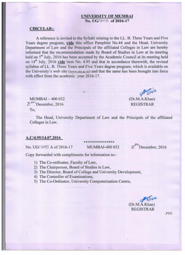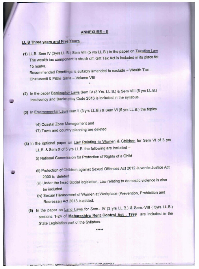 मुंबई विद्यापीठाने एलएलबीसाठी जाहीर केलेल्या परीपत्रकात 'प्रोटेक्शन ऑफ चिल्ड्रन अगेन्स्ट सेक्शुअल ऑफेन्स' २०१२ ( protection of children against sexual offence act 2012) आणि 'जुविनाईल जस्टिस अॅक्ट' २००० ( juvenile justice act 2000 ) हे विषय वगळले आहेत. त्याऐवजी चाईल्ड प्रोटेक्शन, सोशल लिगिसेल्शन, लॉ रिलेटिंग टू डोमॅस्टिक व्हायलन्स, सेक्शुअल हॅरेसमेंट अॅट वुमन वर्कप्लेस ( child protection, social legislation, law relating to domestic violence, sexual harassment of women at workplace (prevention, prohibition, and redressal) act 2013) यांसारखे विविध विषय सामाविष्ट केल्याची माहिती देण्यात आली आहे.