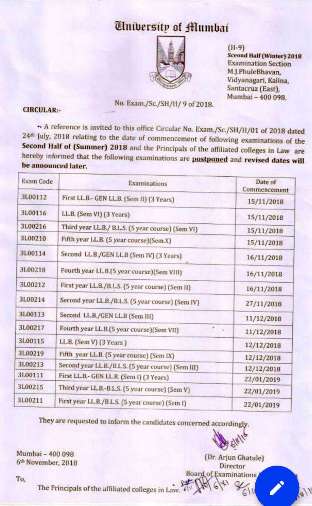 येत्या १५ नोव्हेंबरपासून 'लॉ' ची परीक्षा सुरू होईल असं परीपत्रक विद्यापीठानं जाहीर केलं होतं. मात्र ६०/ ४० परीक्षा पॅर्टनला उच्च न्यायलयातनं स्थगिती दिल्यानं विद्यापीठानं लॉ शाखेच्या परीक्षा पुढे ढकलण्याचा निर्णय घेतला. मात्र या परीक्षा किती गुणांच्या असतील, किती तारखेला होतील याबाबतच परीपत्रक अद्याप विद्यापीठानं जाहीर केलं नसल्यानं अनेक विद्यार्थी संभ्रमात आहेत.