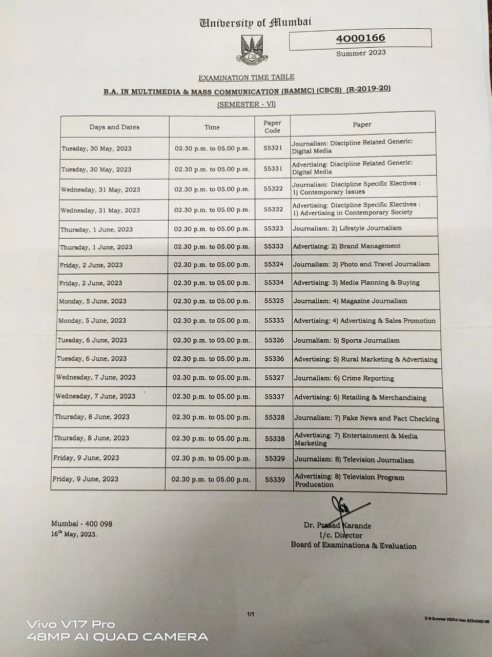 पत्रकारिता आणि जाहिरात या दोन्ही विषयांचा अभ्यास करणार्या उमेदवारांच्या परीक्षा 30 मे 2023 पासून सुरू होणार आहेत आणि त्या 9 जून 2023 पर्यंत चालणार आहेत, त्यानंतर विद्यार्थी त्यांच्या सहाव्या सत्राचा निकाल लागेल.