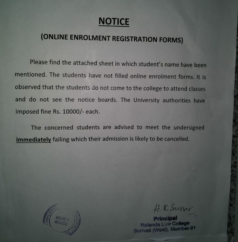 काही महिन्यांपूर्वी लॉ सीईटीची परीक्षा घेण्यात आली. या परीक्षेत पास होणाऱ्या विद्यार्थ्यांचा कॉलेजमध्ये प्रवेश होऊन पहिल्या सेमिस्टरची परीक्षाही नुकतीच पार पडली. परंतु नालंदा लॉ कॉलेजच्या ज्या विद्यार्थ्यांनी प्रवेशासाठी ऑनलाईन अर्ज भरले नसतील त्यांना विद्यापीठाच्या नियमानुसार दहा हजार रुपयाचा दंड आकारण्यात येईल अशी नोटीस लावण्यात आली. विशेष म्हणजे या नोटीसमध्ये प्रत्येक विद्यार्थ्यांनी ही रक्कम रोख स्वरूपात भरावी अशीही सुचना देण्यात आली. त्याशिवाय हा दंड न भरणाऱ्या विद्यार्थ्यांचे प्रवेश रद्द करण्याची धमकीही कॉलेज मार्फत देण्यात आली आहे.