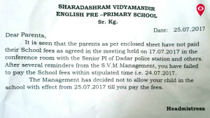 मंगळवारी अर्थात, 25 जुलै रोजी ही लहान मुलं नेहमीप्रमाणे शाळेत गेली. मात्र तुम्ही वाढवलेली फी भरलेली नाही, म्हणून तु्म्हाला शाळेत येता येणार नाही असं शाळा प्रशासनाकडून या मुलांना आणि त्यांच्या पालकांना सांगण्यात आलं. शिवाय जोपर्यंत फी भरली जात नाही, तोपर्यंत विद्यार्थ्यांना शाळेत घेणार नाही अशी लेखी नोटिसही शाळेनं पालकांना पाठवली आहे. त्यामुळे पुन्हा पालकांना विद्यार्थ्यांसोबत शाळेबाहेर ताटकळत उभं रहावं लागलं.