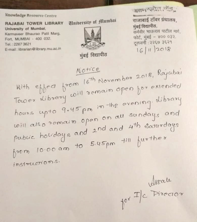 गेल्या अनेक वर्षांपासून मुंबई विद्यापीठाच्या फोर्ट कॅम्पसमधील राजाबाई टॉवर येथे असलेल्या ग्रंथालयाच्या वेळेत बदल करण्याची मागणी विद्यार्थ्यांमार्फत करण्यात येत होती. विद्यार्थ्यांच्या मागणीनुसार मुंबई विद्यापीठातील ग्रंथालय आता रात्री पावणेदहा वाजेपर्यंत सुरू राहणारं असून यामुळं लाखो विद्यार्थ्यांना दिलासा मिळणार आहे. त्याशिवाय दुसरा व चौथा शनिवार, रविवारी व इतर सार्वजनिक सुट्ट्यांच्या दिवशीही विद्यापीठाचं ग्रंथालय सुरू राहणार आहे.