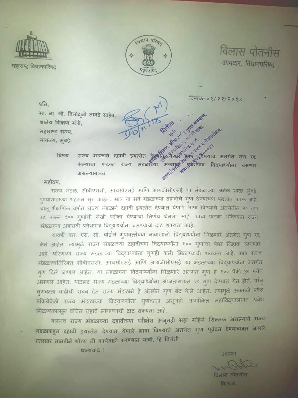 २०१७-१८ या शैक्षणिक वर्षापासून गुणवत्तेच्या नावाखाली विद्यार्थ्यांना मिळणारे भाषाविषयक अंतर्गत गुण तात्काळ रद्द करावेत अशी सूचना शिक्षणमंत्री विनोद तावडे यांनी राज्य मंडळाला केली होती. गेल्या वर्षीपासून इयत्ता नववीच्या विद्यार्थ्यांना हा नियम लागू करण्यात आला आहे. तर या वर्षीपासून दहावीच्या विद्यार्थ्यांना हा नियम लागू करण्यात येईल, अशी सूचना शिक्षणमंत्र्यांनी केली होती.
