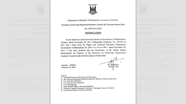 मुंबई विद्यापीठाच्या विद्यार्थी परिषदेतील पहिल्या टप्प्यात युवासेनेनं बाजी मारली आहे. यामध्ये अभाविप उमेदवाराचा अर्ज बाद झाल्याने युवासेनेच्या ओंकार भोपीची मुंबई विद्यापीठाच्या विद्यार्थी परिषदेच्या सचिवपदी बिनविरोध निवड झाली आहे. याची औपचारिक घोषणा ७ फेब्रुवारीला विद्यार्थी कल्याण विभागातर्फे करण्यात येणार असल्याचं मुंबई विद्यापीठाने सांगितलं आहे.