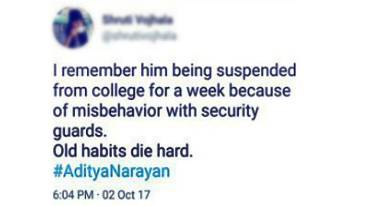 मिठीबाई कॉलेजमध्ये शिकणाऱ्या या विद्यार्थिनीनं इंडिगो एअरलाइन्सच्या कर्मचाऱ्याला शिवीगाळ करतानाच व्हिडिओ पाहिला. त्या व्हिडिओवर तिने ट्वीट केलं की, 'मला आठवत आहे, कॉलेजमध्ये सुरक्षा रक्षकांशी गैरवर्तन केल्याने त्याला एका आठवड्यासाठी कॉलेजमधून निलंबित केलं होतं. जुन्या सवयी लवकर बदलत नाहीत.' आदित्यला निलंबित केल्याची नोटीस कॉलेजच्या नोटीसबोर्डवर लावण्यात आल्याचं देखील तिने ट्वीटमध्ये म्हटलं आहे.