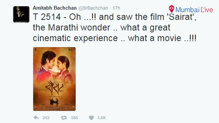 मुंबई - नागराज मंजुळे यांनी दिग्दर्शित केलेला सैराट सिनेमा सगळ्यांच्या पसंतीस पडला होता. मात्र आता तब्बल 9 महिन्यांनंतर बिग बी अमिताभ बच्चन यांनी सैराट पाहिला आणि त्याचं तोंडभरून कौतुकही केलं. ट्विटरवर फोटो शेअर करत त्यांनी सैराटचे कौतुक केले आहे.