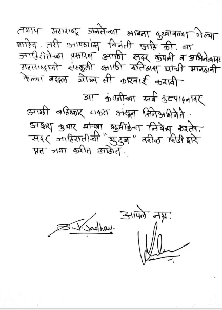 सुर्यकांत जगन्नाथ जाधव यांनी याप्रकरणी तक्रार केली आहे. यात म्हटलं आहे की, जाहीरात बनवणाऱ्या कंपनीवर आणि या जाहिरातीत काम करणाऱ्या कलाकारावर कारवाई करावी, अशी मागणी यात करण्यात आली आहे.