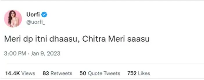 उर्फीने आज तिच्या ट्विटर अकाउंटवर एक ट्वीट केले आहे. यात ती म्हणतेय, 'मेरी डीपी इतनी ढासू, चित्रा मेरी सासू...' तिचे हे ट्वीट बरेच व्हायरल होत आहे. यावर नेटकरीदेखील वेगवेगळ्या प्रतिक्रिया देत आहेत.