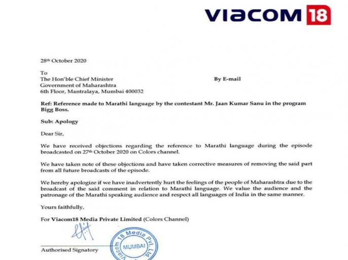 हा वाद अधिक चिघळण्यापूर्वीच कलर्स वाहिनीनं सावध पावलं उचलतं दिलगिरी व्यक्त केली आहे. कलर्स वाहिनीनं झालेली चूक मान्य करत महाराष्ट्रातील जनतेची माफी मागितली आहे. '२७ ऑक्टोबरला प्रसारित झालेल्या बिग बॉसच्या एपिसोडसंदर्भात काही आक्षेप नोंदवण्यात आले आहेत. त्याची दखल घेऊन संबंधित भाग सर्व एपिसोड्समधून काढून घेण्यासाठी पावलं उचलण्यास सुरुवात केली आहे. मराठी भाषेसंदर्भातल्या विधानामुळे महाराष्ट्रातल्या जनतेच्या भावना दुखावल्या असल्यास आम्ही माफी मागतो. आम्ही मराठी प्रेक्षकांचा आदर करतो. भारतातल्या सगळ्याच भाषांचा आम्ही आदर करतो, असं कलर्स वाहिनीने मुख्यमंत्र्यांना लिहिलेल्या पत्रात म्हटलं आहे.