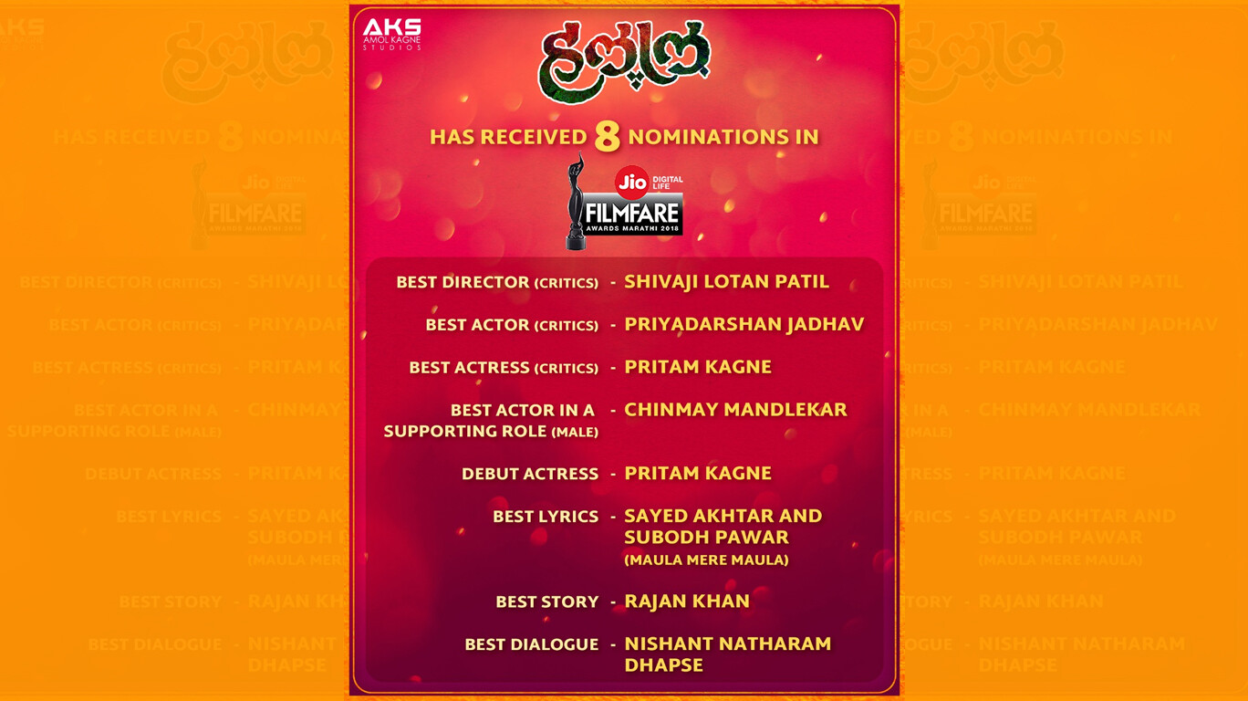 शिवाजी लोटन पाटील यांना दिग्दर्शनासाठी क्रिटिक्स नामांकन, प्रियदर्शन जाधवला सर्वोत्कृष्ट अभिनेत्यासाठी क्रिटिक्स नामांकन, प्रीतम कागणेला सर्वोत्कृष्ट अभिनेत्री क्रिटिक्स नामांकन आणि पदार्पणासाठीही नामांकन मिळालं आहे. तसंच चिन्मय मांडलेकरला सहाय्यक अभिनेत्यासाठी, सईद अख्तर यांना ‘मौला मौला...’ या गाण्यासाठी, सुबोध पवार यांना सर्वोत्कृष्ट गीतासाठी, राजन खान यांना सर्वोत्कृष्ट कथेसाठी आणि निशांत ढापसे यांना सर्वोत्कृष्ट पटकथेसाठी नामांकन मिळाली आहेत.