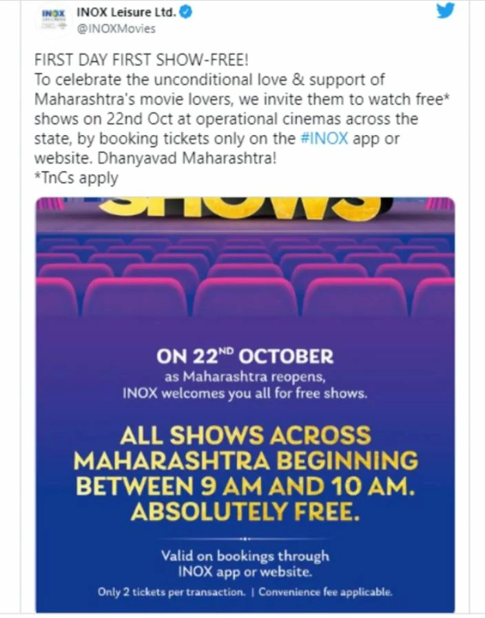 लोकांना ही ऑफर INOX वेबसाइट आणि अॅपवर मिळेल. इथं तुम्ही सकाळी ९ ते सकाळी १० पर्यंत बुकिंग करून ही मोफत तिकिटे घेऊ शकता. केवळ महाराष्ट्रात राहणाऱ्या लोकांनाच इनॉक्सच्या या ऑफरचा लाभ मिळू शकतो. या उपक्रमाद्वारे, INOX ला फक्त आपल्या पाहुण्यांचे आभार मानायचे आहेत.