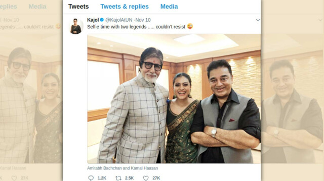 '23वें कोलकाता इंटरनेशनल फिल्म फेस्टिवल' नुकतीच सुरवात झाली आहे. या ठिकाणी बॉलिवूड चे बरेच कलाकार उपस्थित होते. अमिताभ बच्चन बरोबरच शाहरुख खान , कमल हसन , महेश भट्ट आणि काजोल ही उपस्थित होते. यावेळी काजोल ने तिच्या ट्विटर अकाउंट वरून एक फोटो शेअर केला ज्यात तिच्याबरोबर अमिताभ बच्चन आणि कमल हसन आहेत.हा फोटो शेअर केल्यानंतर लगेचच सोशल मीडियावर काजोलला ट्रोल करायला सुरवात झाली.