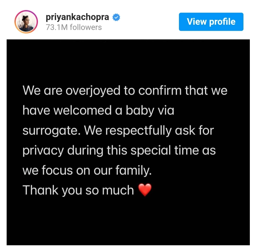 प्रियांका आणि निक यांनी त्यांच्या पोस्टमध्ये बाळाबाबत उघडपणे सांगितले नाही. त्यांनी पोस्ट फक्त म्हटलं आहे की, "आम्ही सरोगेटद्वारे बाळाचे स्वागत केले आहे. हे सांगताना आम्हाला खूप आनंद होत आहे. आम्ही आमच्या कुटुंबावर लक्ष केंद्रित करत असल्यामुळे आम्ही आदरपूर्वक गोपनीयतेची विनंती करतो. खूप खूप धन्यवाद."