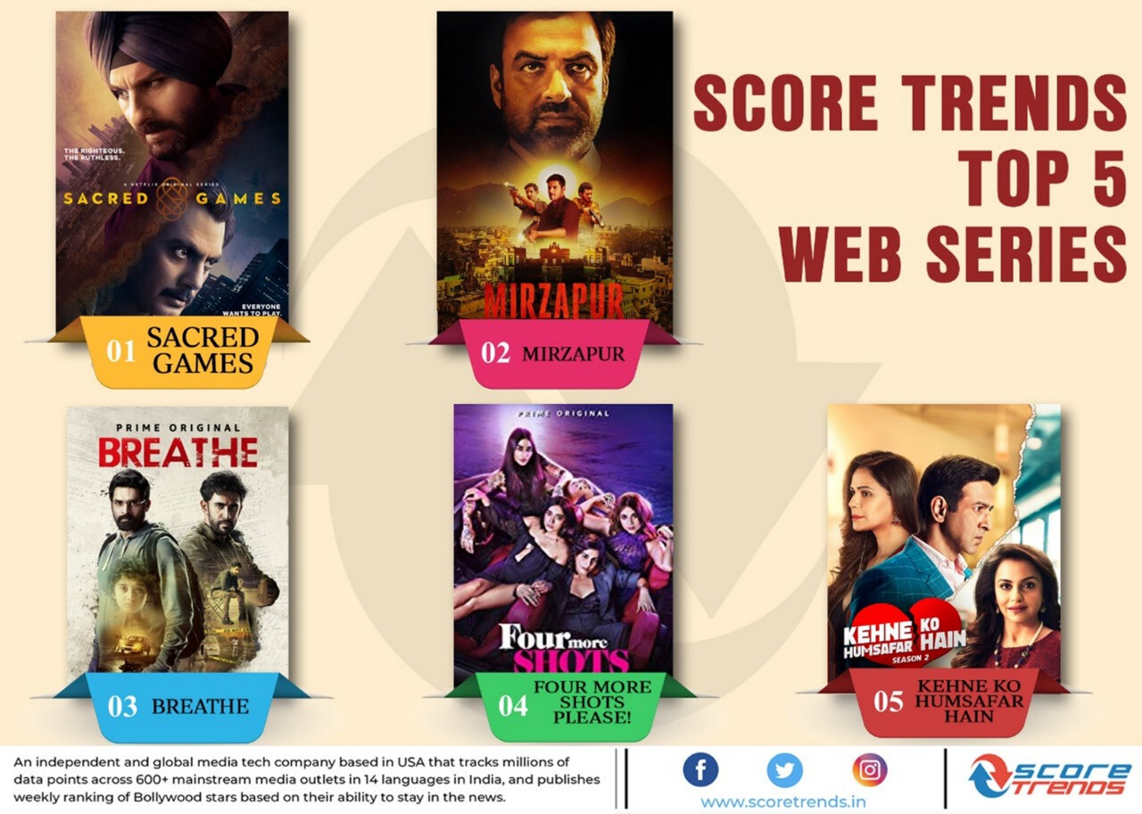 स्कोर ट्रेंड्सनं जाहीर केलेल्या आकड्यांनुसार सध्या लोकप्रियतेत 'सेक्रेड गेम्स' पहिल्या क्रमांकावर आहे. त्यापाठोपाठ दुसऱ्या स्थानी 'मिर्जापूर' आहे. आर. माधवन आणि अमित साध यांची भूमिका असलेली अमेझॉन प्राइमची वेब सिरीज 'ब्रीद' तिसऱ्या क्रमांकावर आहे, तर किर्ती कुल्हारी-सायनी गुप्ता स्टारर 'फोर मोर शॉट्स प्लीज' चौथ्या स्थानी आहे. रोनित रॉय-मोना सिंह यांच्या भूमिका असलेली 'कहने को हमसफर है' पाचव्या स्थानावर विराजमान आहे.