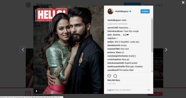 शाहिदने स्वतः त्याच्या सोशल अकाउंटद्वारे हा फोटो शेअर केला आहे. शाहिदने हा फोटो शेअर केल्यानंतर लगेचच या दोघांचा हा फोटो सोशल मीडियावर व्हायरल होऊ लागला. या फोटोमध्ये शाहिद काळ्या रंगाच्या पारंपारिक पेहेरावात दिसत आहे आणि त्याची पत्नी मीरा हलक्या हिरव्या रंगाच्या ब्लाउज आणि गुलाबी रंगाच्या लेहेंग्यामध्ये दिसत आहे. शाहिदने हा फोटो शेअर केल्यावर लगेचच त्याच्या फॅन्सने त्या दोघांचंही कौतुक केलं आहे.