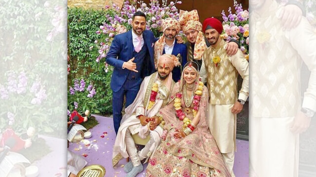लग्नात अनुष्काचा आणि विराट या दोघांचा पोषाख सब्यसाची मुखर्जी यांनी तयार केला. अनुष्काचा लहेंगा तयार करायला त्यांच्या संपूर्ण टीमनं विशेष मेहनत घेतली आहे. लेहंगा तयार करण्यासाठी तब्बल ६७ कारागीर लागले. या सर्व कारागिरांनी मिळून ३२ दिवसांमध्ये हा शाही लेहंगा तयार करण्यात आला. फिकट गुलाबी रंगाचा हा लेहंगा अनुष्कावर फार उठून दिसत आहे.लेहंग्यावरील नक्षीकाम हातानं केलं आहे त्यामुळे तो आणखीन आकर्षक वाटत आहे.