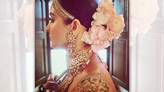 अनुष्काच्या दागिन्यांवरही विशेष मेहनत घेतली आहे. या दागिन्यात पैलू न पाडलेले खडे आणि जपानी मोत्यांचा वापर करण्यात आला आहे. यासोबतच तिनं २२ कॅरेटचे सोन्याचे झुमके घातले आहेत. या झुमक्यातही पैलू न पाडलेले खडे आणि जपानी मोत्यांचा वापर करण्यात आला. अनुष्कानं घातलेल्या पंजाबी चपलांवर हातानं नक्षीकाम केले गेले होते.