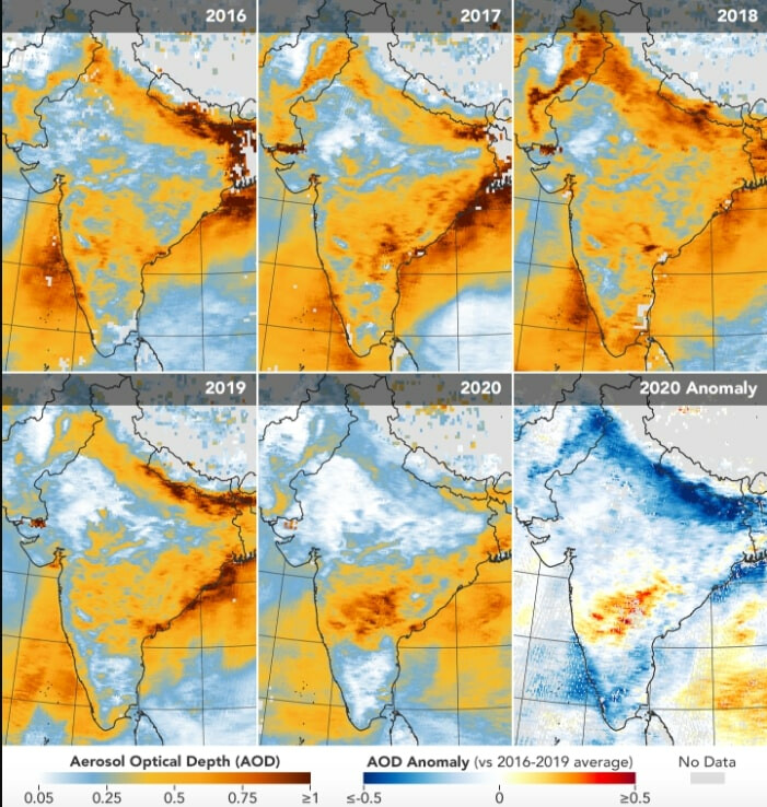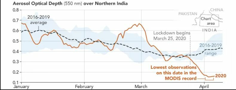 नासानुसार, उत्तर भारतात हवेचे प्रदुषण सर्वाधिक निचांक पातळीवर आहे. लॉकडाऊन सुरू झाल्यानंतर उत्तर भारतातील हवेतील प्रदुषणाचा स्तर कमी झाला आहे.