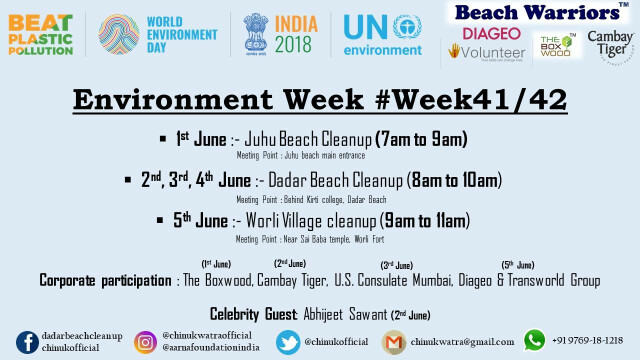 पर्यावरण दिनानिमित्त १ जून ते ५ जून असे ५ दिवस वेगवेगळ्या ठिकाणी स्वच्छता मोहीम राबवण्यात आली आहे. १ जूनला जुहू बीच, २ ते ४ जून दादर बीच आणि ५ जून वरळी व्हिलेज अशा ठिकाणी मोहीम राबवण्यात येणार आहे.२ जूनला दादर बीचवर होणाऱ्या मोहिमेत गायक अभिजीत सावंत सहभागी होणार आहे.