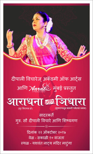 ‘आराधना’ हा दीपाली विचारेज अकॅडेमी ऑफ आर्ट्सचा वार्षिक कार्यक्रम आहे. या कार्यक्रमात दीपाली विचारे यांच्या सगळ्या शिष्या ‘कट्यार काळजात घुसली’ या चित्रपटातील गीतांवर ताल अंगाच्या साथीने कथ्थक नृत्याविष्कार सादर करतील. नृत्यांगणा दीपाली विचारे व त्यांच्या सिनिअर शिष्या त्रिधारा सादर करतील. त्रिधारेतून ‘श्रृंगारापासून भक्तीरसा’पर्यंतचा प्रवास दाखवला जाईल. त्रिधारेचे वैशिष्ट्य म्हणजे दीपाली विचारे यात स्वत: कवितेच्या सादरीकरणासह नृत्याविष्कार करणार आहेत. सितार, तबला आणि घुंगरांची जुगलबंदी असलेल्या त्रिधारेतून नृत्याच्या वेगवेगळ्या छटांचे दर्शन रसिकांना घडेल. अनेक मान्यवर या कार्यक्रमाला उपस्थित राहणार आहेत.