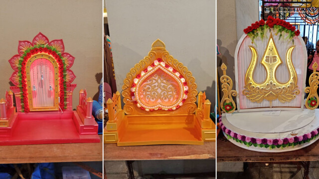 इकोफ्रेंडली मखर हे रंगीबेरंगी कपडे, कागद, लाकूड, पुठ्ठा, रबर सीट, सनमाइका आणि आर्टिफिशीअल फूलं, मण्यांची तोरण, फुलांच्या माळा यांनी तयार केलेले आहेत. या इको फ्रेंडली मखरांची किंमत ४ हजारांपासून ते ८ हजारपर्यंत आहे.