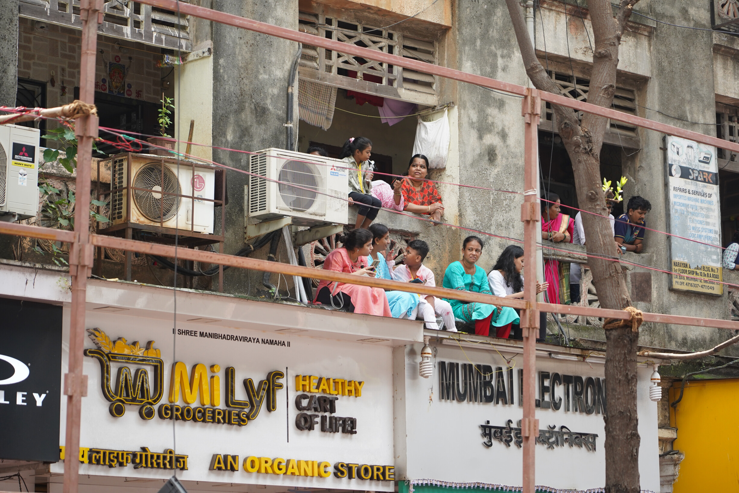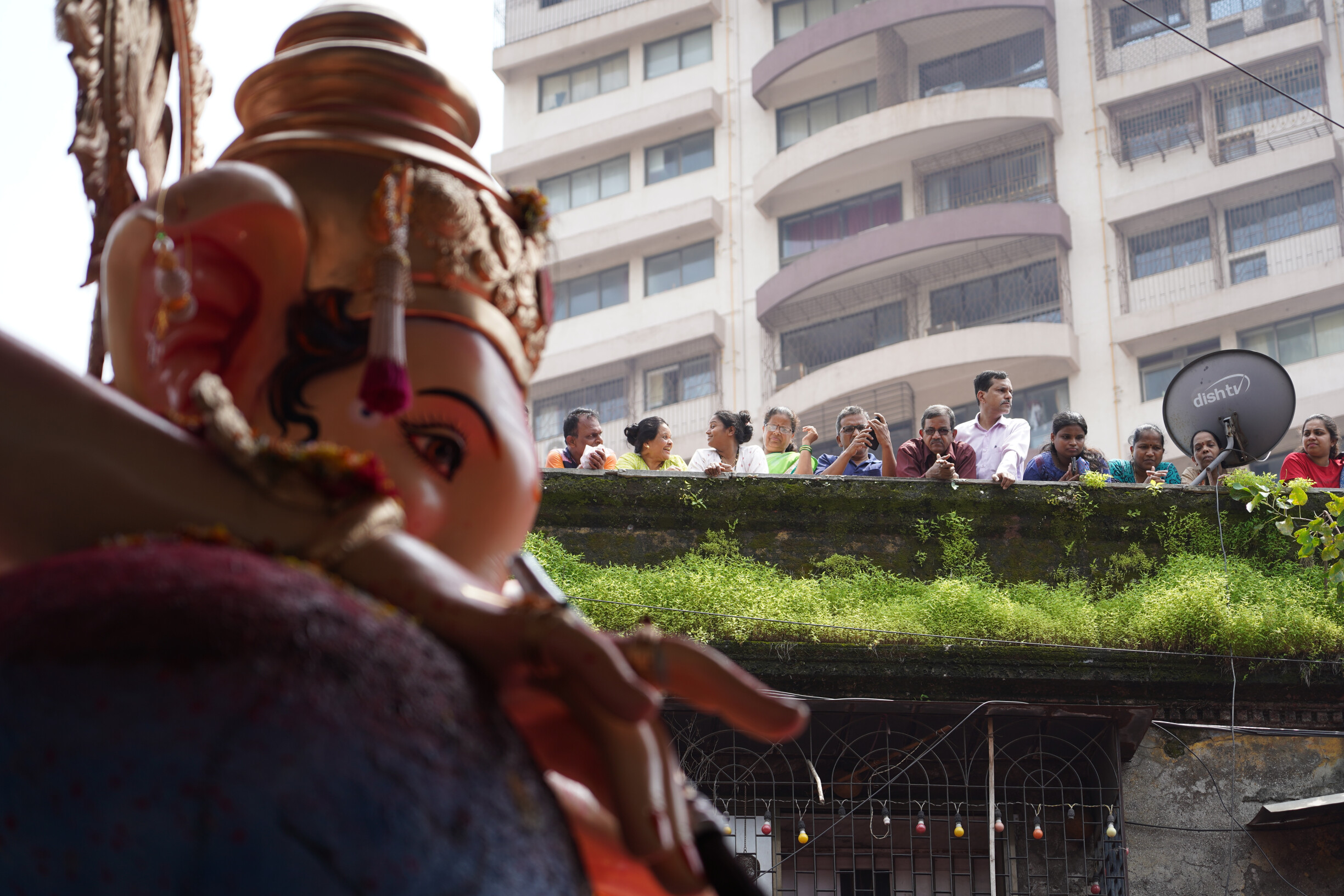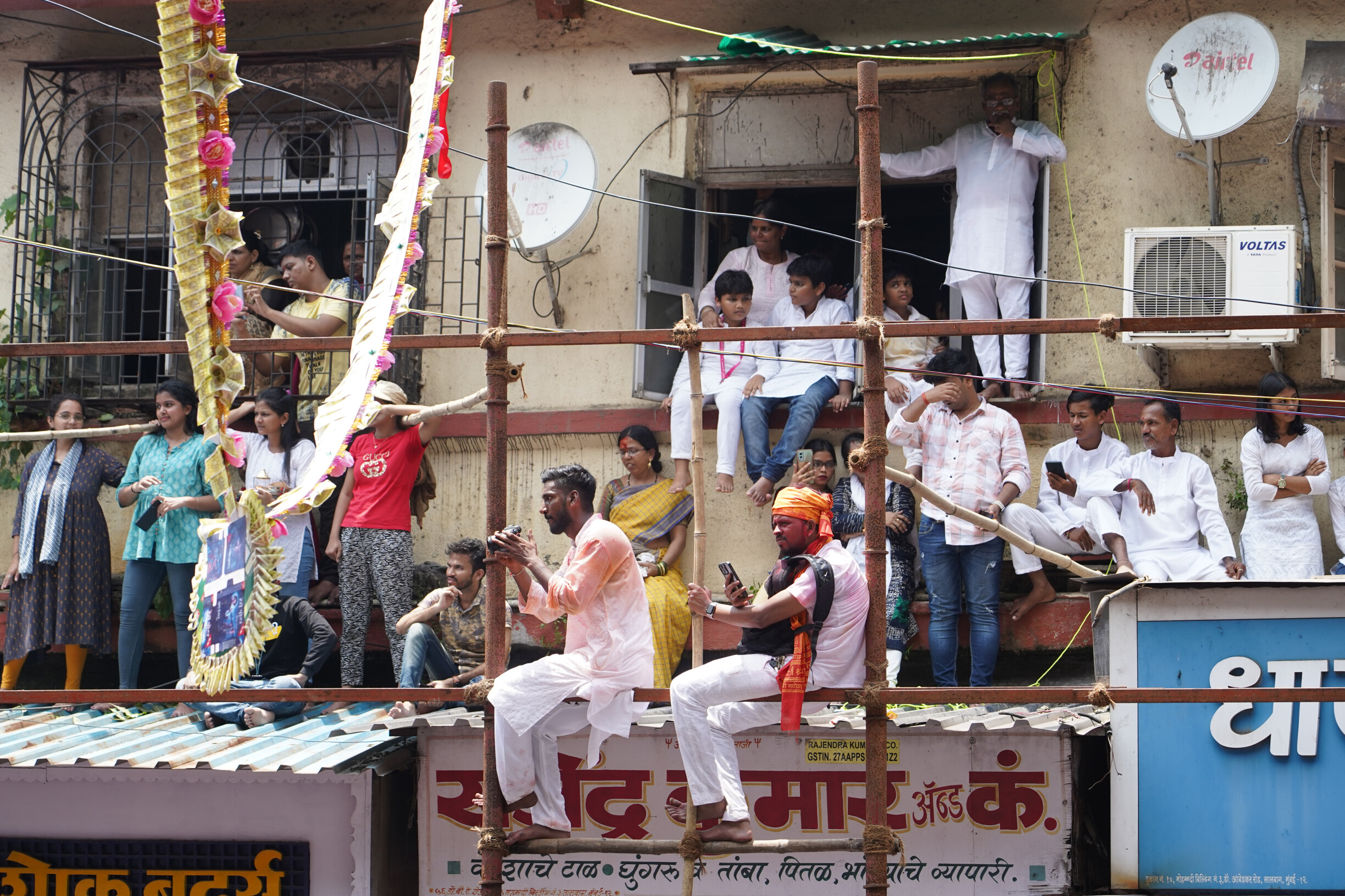बाप्पाच्या दर्शनासाठी लोक सकाळपासून घरांच्या बाल्कनीत आणि दुकानांच्या गच्चीवर उभे असल्याचे दिसून आले.