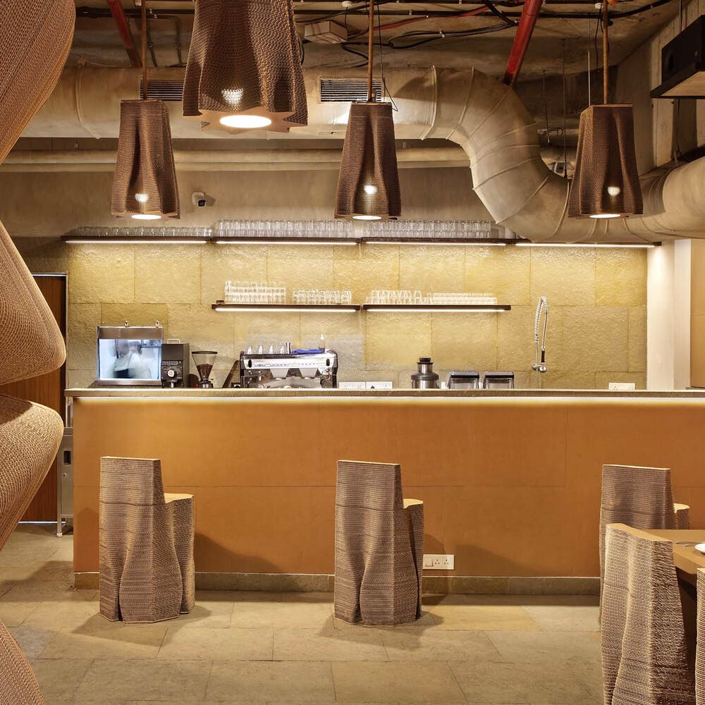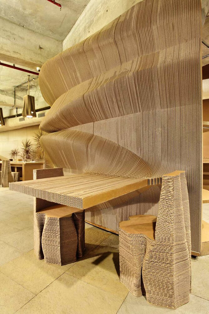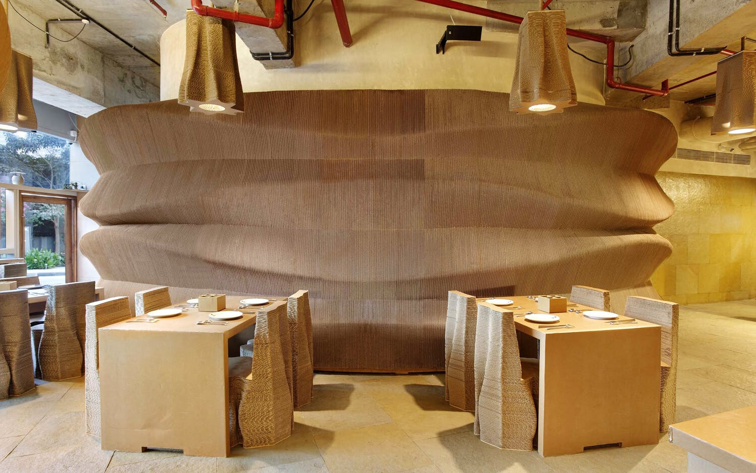 तर यासाठी एकावर एक असे अनेक कार्डबोर्ड वापरण्यात आले आहेत आणि त्यापासून एक जाडसर शीट तयार करण्यात आली आहे. कार्डबोर्डचा वापर करून बनवण्यात आलेल्या सर्व सामानांवर वॅक्स म्हणजे मेणाचा थर लावला जातो. यामुळे पाणी लागून टेबल किंवा खुर्ची खराब होत नाही. नुरू करीम यांनी या रेस्टॉरंटचं इंटिरीयर केलं आहे.