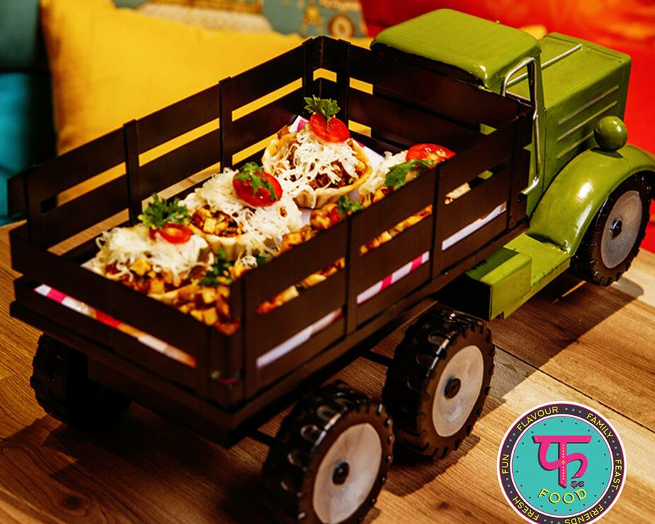 'फ से फूड'मधला प्रत्येक पदार्थ हा हटके तर आहेच. त्यासोबतच एखादा पदार्थ सर्व्ह करण्याची पद्धत देखील हटके आहे. स्टार्टर म्हणून तुम्ही 'बाकरवडी चकली चाट' ऑर्डर करू शकता. नाव वाचूनच तुम्हाला हा प्रकार वेगळा असल्याचं तुम्हाला कळालच असेल. बाकरवड्या आणि चकल्यांबरोबर फरसाण, कांदा, टोमेटो टाकून केलेला एक कुरकुरीत चाट आयटम. सर्वात महत्त्वाचं म्हणजे बाकरवडी चकली चाट सर्व्ह करण्याची पद्धत. एखाद्या साध्या-सुध्या डिशमध्ये सर्व्ह न करता खेळण्यातल्या एका हातगाडीवर बाकरवडी चकली चाट सर्व्ह केला जातो.