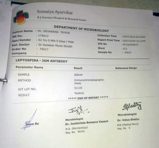सायन प्रतीक्षानगर इथं राहणारे ४२ वर्षीय देवानंद तायडे यांना १० जुलै रोजी लेप्टोची लागण झाल्याचं त्यांच्या मेडिकल रिपोर्टद्वारे कळलं. त्यांच्यावर मुंबईतील सोमय्या रुग्णालयात उपचार सुरू होते, पण उपचारादरम्यान त्यांचा रविवारी रात्री मृत्यू झाला.