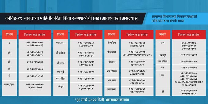 या क्रमांकांच्या माध्यमातून संबंधित व्यक्ती किंवा रुग्णाला आपल्या वॉर्डमधल्या कंट्रोल रुमला फोन करून कुठल्या रुग्णालयात बेडशी संबंधित किंवा कोविड-१९ शी संबंधित सर्व माहिती मिळवता येणार आहे.