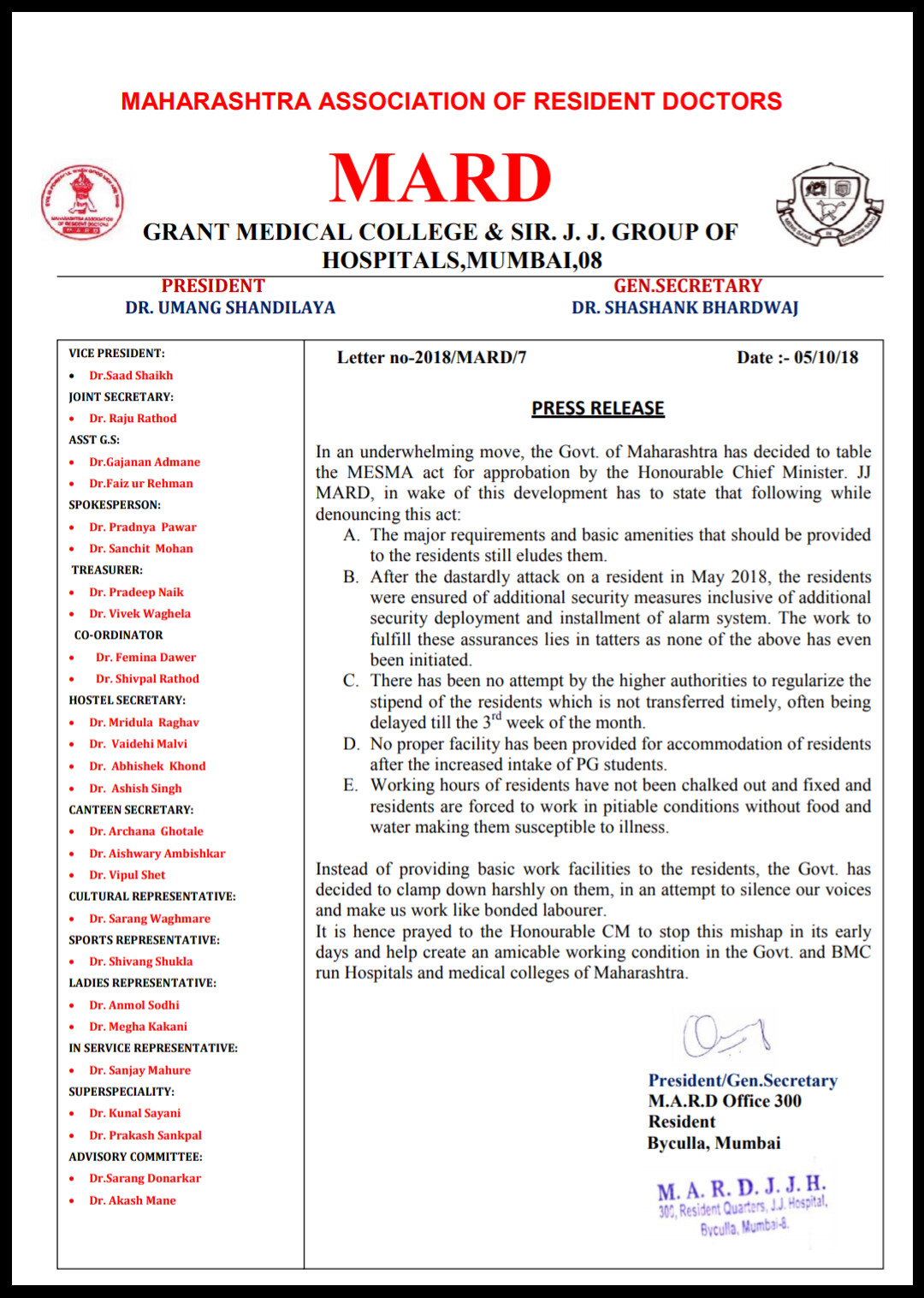 राज्यातील सरकारी वैद्यकीय महाविद्यालयात डॉक्टर, नर्स आणि इतर कर्मचाऱ्यांना संपावर जाण्यापासून रोखण्यासाठी सरकारने ‘मेस्मा’ म्हणजेच 'महाराष्ट्र अत्यावश्यक सेवा कायद्या'चं हत्यार उपसलं आहे. पण, निवासी डॉक्टरांची संघटना मार्ड आणि इंटर्न डॉक्टरांच्या संघटनेने सरकारच्या या प्रस्तावाला चांगलाच विरोध दर्शवला आहे. काही दिवसांपूर्वी वैद्यकीय शिक्षण विभागानं आरोग्य व्यवस्था पुरवणाऱ्यांवर 'मेस्मा' लावण्याचा निर्णय घेतला असून याबाबतचा प्रस्ताव मुख्यमंत्री देवेंद्र फडणवीस यांच्याकडे पाठवण्यात आला होता. त्याविरोधात सर्व डॉक्टर एकवटले आहेत.