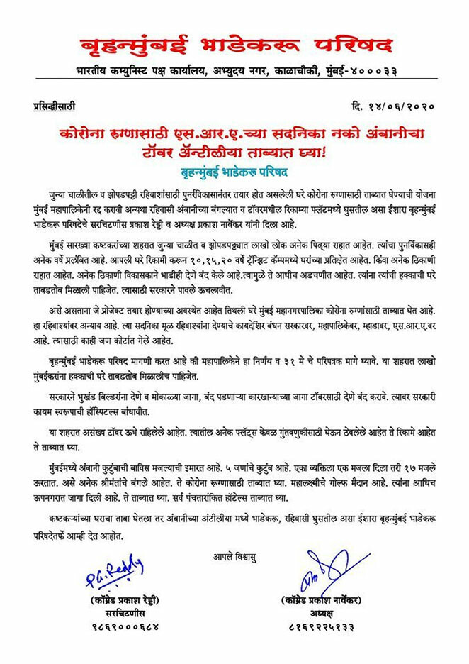 बृहन्मुंबई भाडेकरु परिषदेकडून प्रसिद्धीपत्रक जारी करण्यात आलं आहे. त्यात म्हटलं आहे की, शहरात असंख्य टॉवर उभे राहिले आहेत. केवळ गुंतवणुकीसाठी त्यातील अनेक फ्लॅट्स घेऊन ठेवलेले आहेत. जे रिकामी आहेत ते महापालिकेनं घ्यावे. त्याचबरोबर प्रसिद्ध उद्योगपती अंबानी कुटुंबियांची मुंबईत २२ मजल्यांची इमारत आहे. पाच जणांचे कुटुंब आहे. एका व्यक्तीला एक मजला दिला तरी १७ मजले उरतात, अशा प्रकारे मुंबईत अनेक श्रीमंतांचे बंगले आहेत. ते कोरोनाबाधितांच्या उपचारासाठी ताब्यात घ्या.