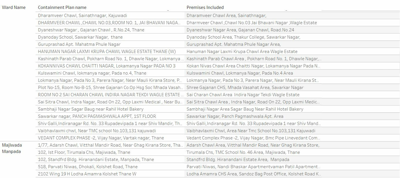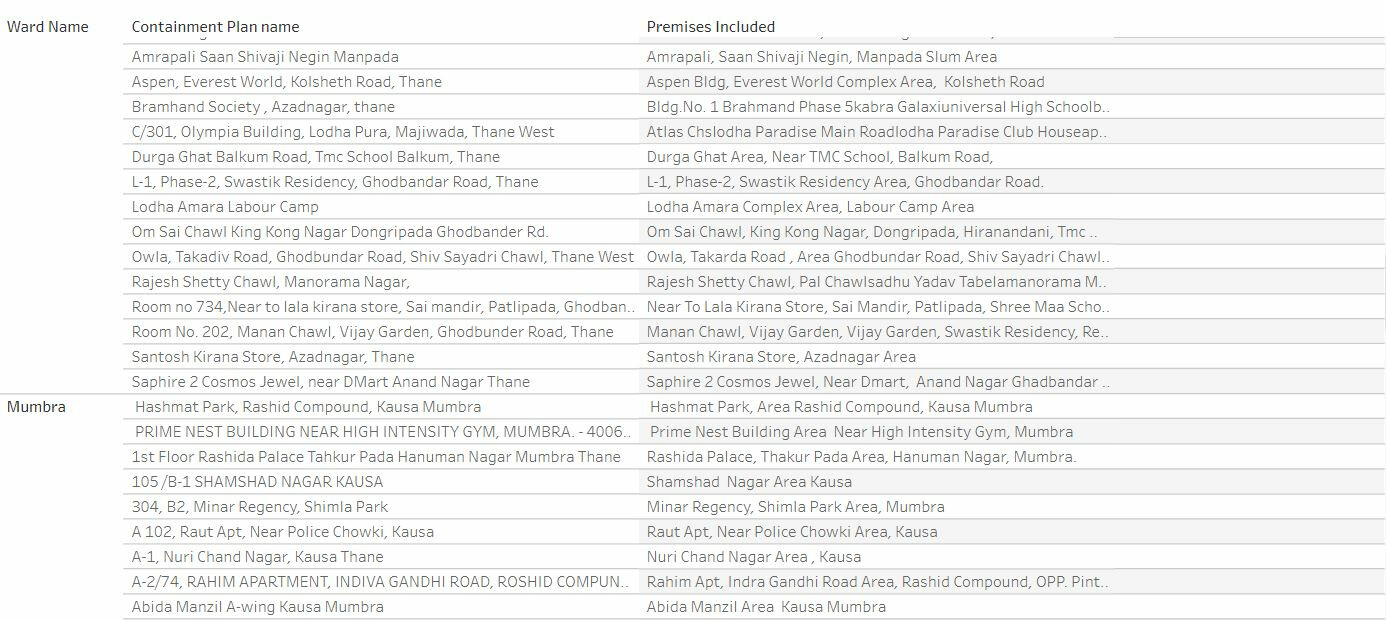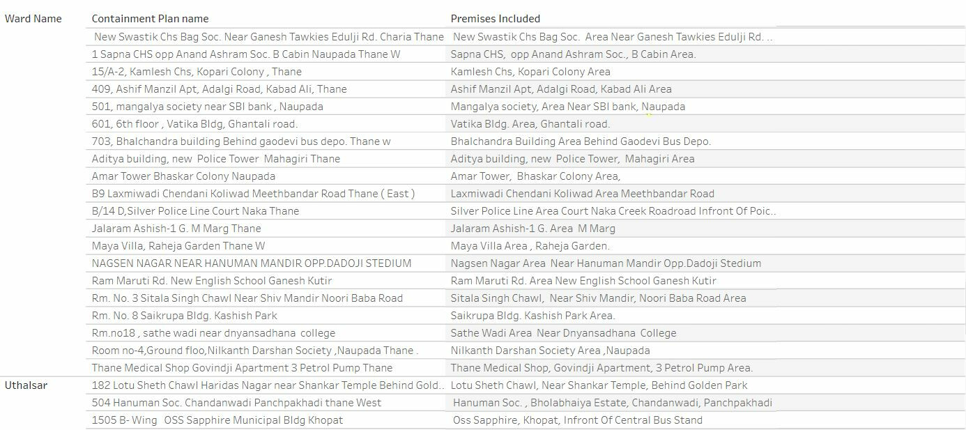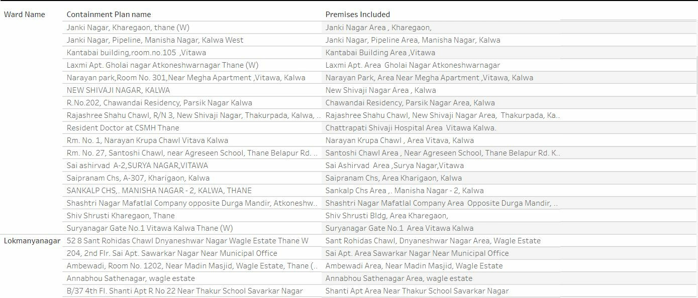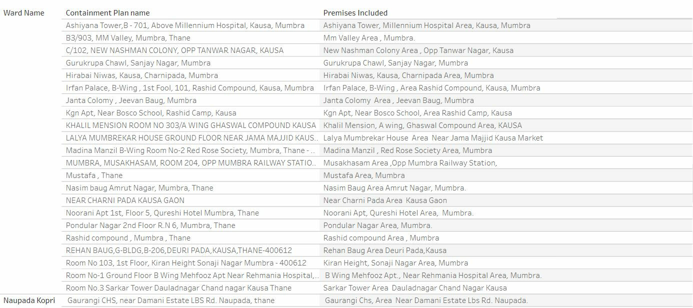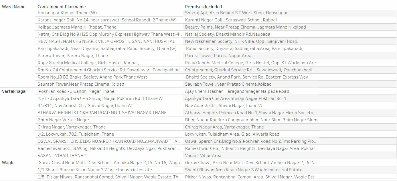ठाणे महापालिकेने जाहीर केलेली कंटेन्मेंट झोनची यादी पुढील प्रमाणे: