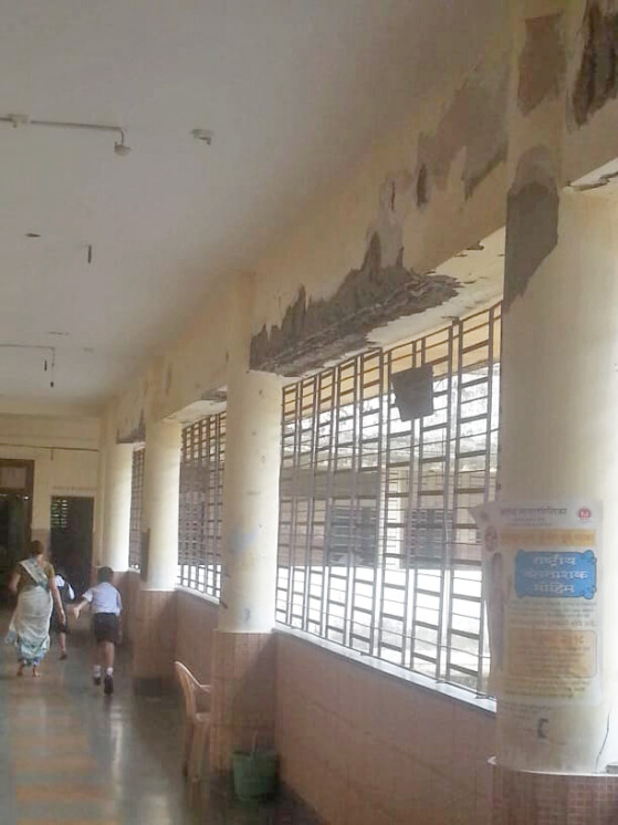 वरळी नाका इथं पालिकेची वरळी नाका प्राथमिक शाळा क्रमांक-३ शाळा आहे. मराठी, हिंदी, तेलगू आणि उर्दू भाषेतून या शाळेत शिक्षण दिलं जातं. ८ पर्यंती ही शाळा असून या शाळेत ५०० हून अधिक विद्यार्थी असल्याचं समजतं आहे. अशा या शाळेचं नूतनीकरण महापालिकेकडून २०१० मध्ये करण्यात आलं होतं. पण अवघ्या ४ वर्षांतच शाळेच्या स्लॅबचं प्लास्टर गळू लागलं आहे. तर पिलरला, काॅलमला आणि भिंतींना तडे गेले आहेत. प्लास्टर वा स्लॅब कधीही पडण्याची आणि विद्यार्थ्यांच्या जीवाला धोका निर्माण होण्याचीही शक्यता निर्माण झाली आहे.