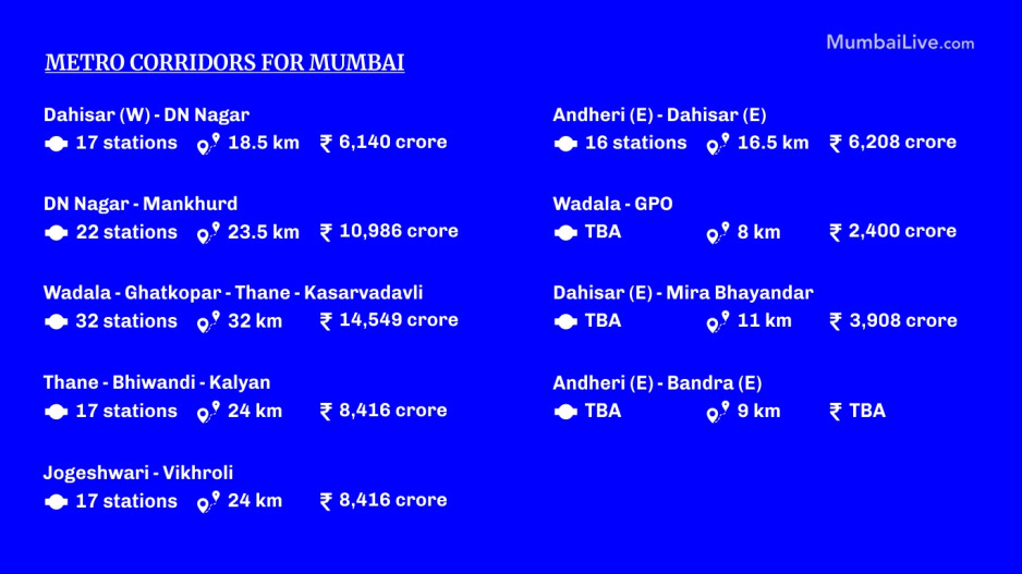 या मेट्रो मार्गाव्यतिरिक्त अन्यही मेट्रो मार्गाची कामे यंदा 'एमएमआरडीए'ने हाती घेतली आहेत. त्या प्रामुख्याने उल्लेख होईल तो वडाळा ते जीपीओ मेट्रो-८, अंधेरी पूर्व ते वांद्रे पूर्व मेट्रो-९ आणि दहिसर ते मिरा-भाईंदर मेट्रो-१० या मार्गांचा. एकूणच २०१७ मध्ये 'एमएमआरडीए'ने मुंबईभर मेट्रोचे जाळे विणण्याचा निर्णय घेतला असून यासाठी तब्बल ६२, ९४३ कोटी रुपये इतका खर्च 'एमएमआरडीए'कडून करण्यात येणार आहे.