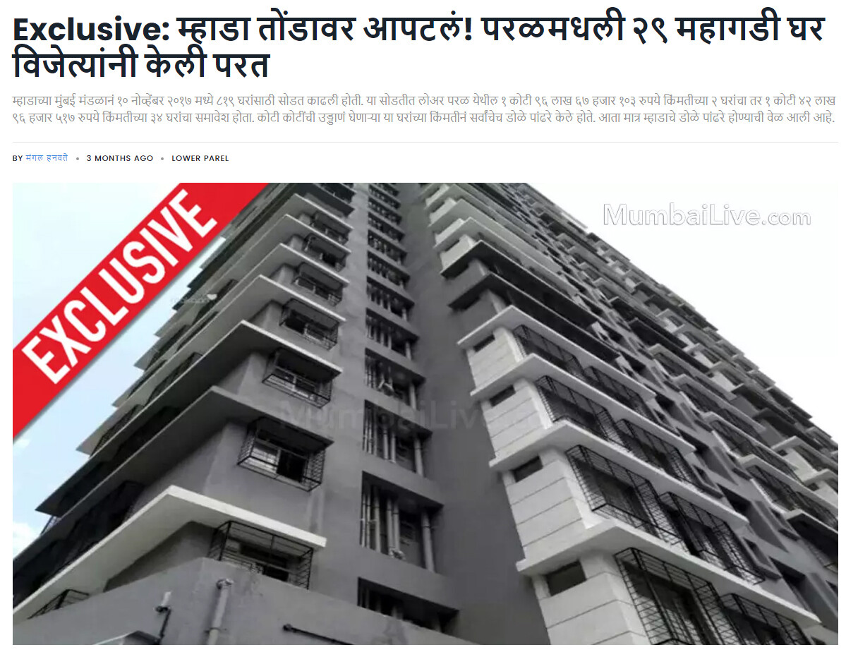 म्हाडाच्या मुंबई मंडळाच्या लाॅटरीतील लोअर परळमधील १ कोटी ९५ लाख आणि १ कोटी ४५ लाख रुपयांची महागडी २८ घरं विजेते आणि प्रतिक्षा यादीवरील विजेत्यांनी नाकारली आहेत. ही घरं मंडळाला परत केली असून हा मंडळासाठी मोठा दणका असल्याची बातमी सर्वप्रथम मुंबई लाइव्हनं दिलं होती. तर यंदाच्या लाॅटरीतील अत्यल्प उत्पन्न गटातील घर ३१ लाखांमध्ये विकलं जाणार असून या घरासाठी विजेत्यांना कोणतीही बँक कर्ज देणार नाही, यासंबंधीचं वृत्तही देत मुंबई लाइव्हनं म्हाडाच्या महागड्या घरांचा विषय उचलून धरला होता.