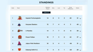 सध्या झोन ए मध्ये गुजरात संघ हा 14 सामने खेळून 51 गुणसंख्येने अव्वल स्थानावर आहे. तर यू मुम्बा 14 सामने खेळून 39 गुण संख्येने तिसऱ्या स्थानावर कायम आहे.
