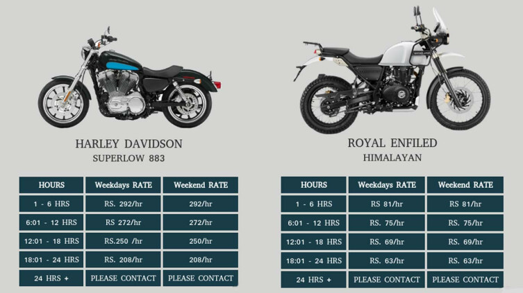सध्या रेबल राईडकडे हार्ले डेव्हिडसन, हार्ले डेव्हिडसन आर्यन ८८३, क्लासिक इनफिल्ड ५०० आणि हिमालयन इनफिल्ड उपलब्ध आहे. हार्ली डेव्हिडसन, हार्ले डेव्हिडसन आर्यन ८८३ या बाईक्सचे एका तासासाठी २९२ आकारले जातील. क्लासिक इन्फिल्ड ५൦൦ आणि हिमालयन रॉयल इनफिल्ड या बाईक्सचे एका तासासाठी ८१ रूपये आकारले जातील.